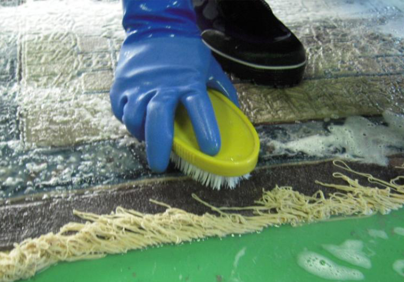 デア絨毯工房のクリーニングでは、絨毯を広げた状態で職人がブラッシングを行います。